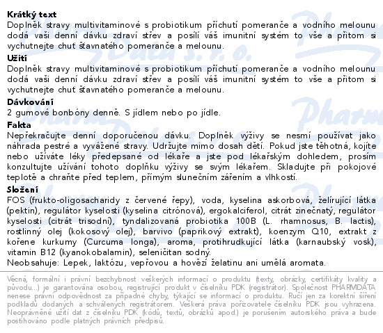 Doplněk stravy multivitaminové s probiotikum příchutí pomeranče a vodního melounu dodá vaši denní dávku zdraví střev a posílí váš imunitní systém to vše a přitom si vychutnejte chuť šťavnatého pomeranče a melounu.