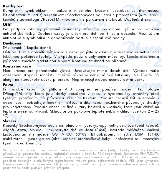 Komplexní symbiotikum - bakterie mléčného kvašení (Lactobacillus rhamnosus, Bifidobacterium lactis) s kvasinkami Saccharomyces boulardii a prebiotikem (6 miliard/1 kapsle) s technologií DRcapsTM, vhodné při a po užívání antibiotik. Doplněk stravy.