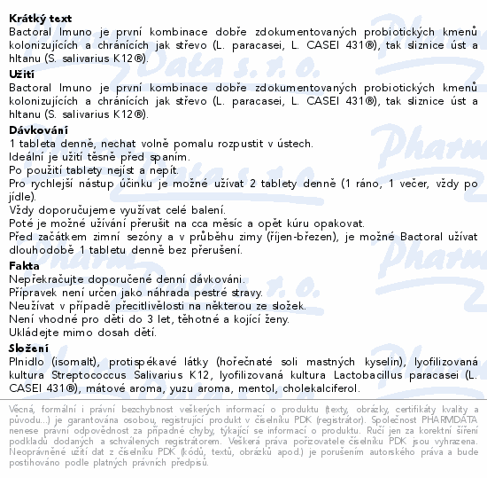 Bactoral Imuno je první kombinace dobře zdokumentovaných probiotických kmenů kolonizujících a chránících jak střevo (L. paracasei, L. CASEI 431®), tak sliznice úst a hltanu (S. salivarius K12®).
