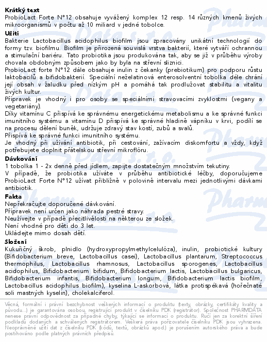 ProbioLact Forte N°12 obsahuje vyvážený komplex 12 resp. 14 různých kmenů živých mikroorganismů v počtu až 10 miliard v jedné tobolce.