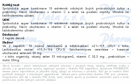 GS Probiotic Strong je doplněk stravy s unikátním komplexem 10 odolných kmenů probiotik. Denní dávka (2 kapsle) obsahuje minimálně 21 miliard životaschopných mikroorganismů. Navíc je obohacen o prebiotika, důležitá pro výživu probiotik, vitamin C a selen, které podporují správnou funkci imunitního systému. Vhodný při a po užívání antibiotik a po celý rok pro dlouhodobé posílení imunity.