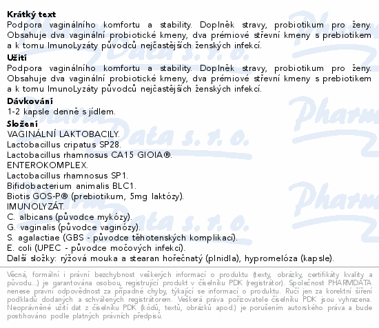 Podpora vaginálního komfortu a stability. Doplněk stravy, probiotikum pro ženy. Obsahuje dva vaginální probiotické kmeny, dva prémiové střevní kmeny s prebiotikem a k tomu ImunoLyzáty původců nejčastějších ženských infekcí.