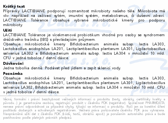 Přípravky LACTIBIANE podporují rozmanitost mikrobioty našeho těla. Mikrobiota má vliv například na zažívací sytém, imunitní systém, metabolismus, či duševní zdraví. LACTIBIANE Tolérance obsahuje vybrané mikrobiotické kmeny pro podporu mikrobioty.