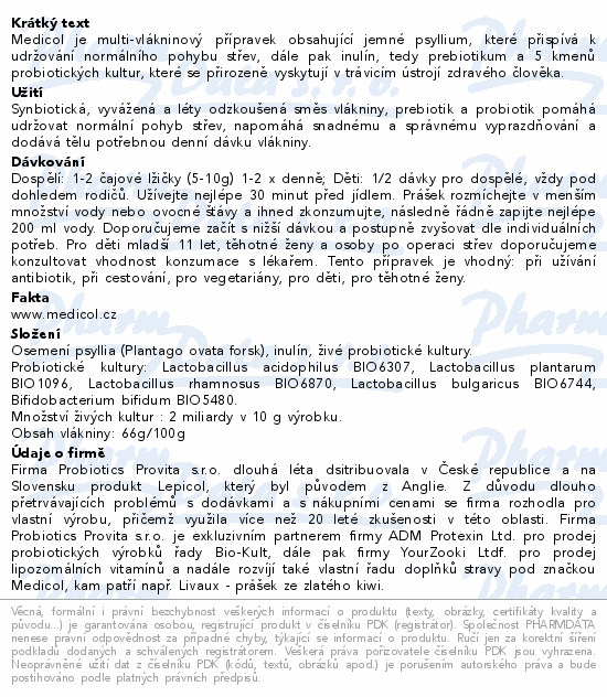 Medicol je multi-vlákninový přípravek obsahující jemné psyllium, které přispívá k udržování normálního pohybu střev, dále pak inulín, tedy prebiotikum a 5 kmenů probiotických kultur, které se přirozeně vyskytují v trávicím ústrojí zdravého člověka.
