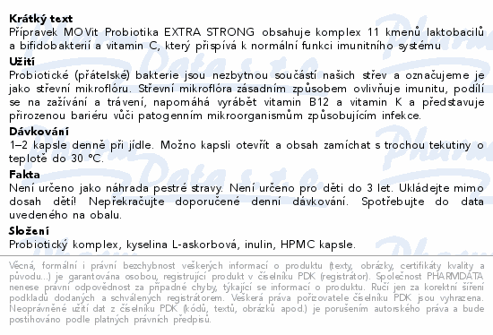 Přípravek MOVit Probiotika EXTRA STRONG obsahuje komplex 11 kmenů laktobacilů a bifidobakterií a vitamin C, který přispívá k normální funkci imunitního systému