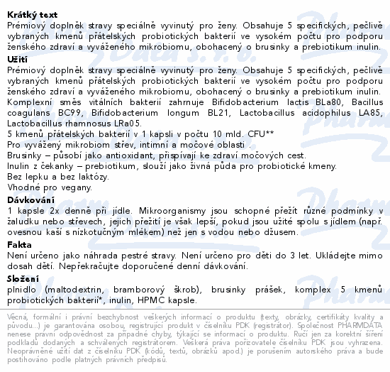 Prémiový doplněk stravy speciálně vyvinutý pro ženy. Obsahuje 5 specifických, pečlivě vybraných kmenů přátelských probiotických bakterií ve vysokém počtu pro podporu ženského zdraví a vyváženého mikrobiomu, obohacený o brusinky a prebiotikum inulin.