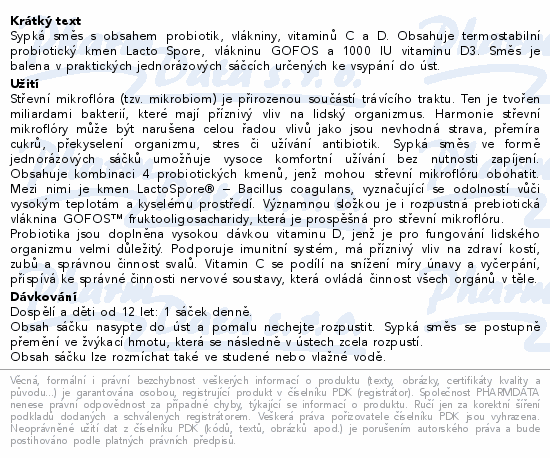 Sypká směs s obsahem probiotik, vlákniny, vitaminů C a D. Obsahuje termostabilní probiotický kmen Lacto Spore, vlákninu GOFOS a 1000 IU vitaminu D3. Směs je balena v praktických jednorázových sáčcích určených ke vsypání do úst.