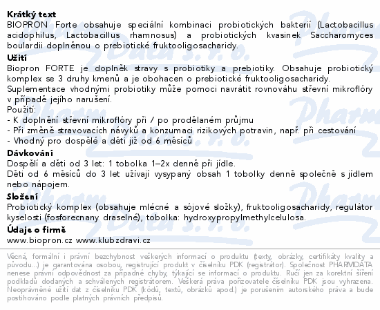 BIOPRON Forte obsahuje speciální kombinaci probiotických bakterií (Lactobacillus acidophilus, Lactobacillus rhamnosus) a probiotických kvasinek Saccharomyces boulardii doplněnou o prebiotické fruktooligosacharidy.