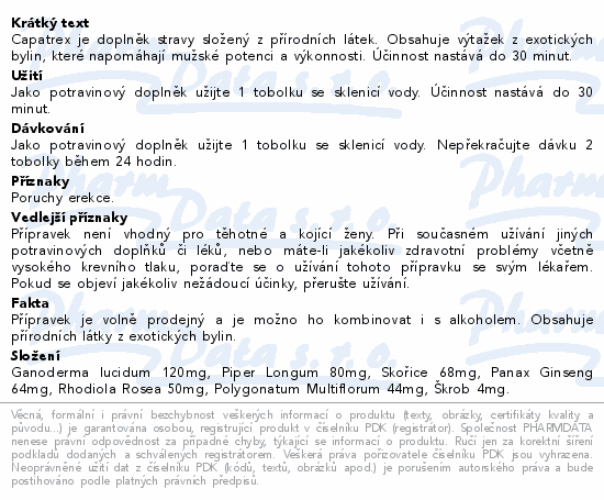 Capatrex je doplněk stravy složený z přírodních látek. Obsahuje výtažek z exotických bylin, které napomáhají mužské potenci a výkonnosti. Účinnost nastává do 30 minut.