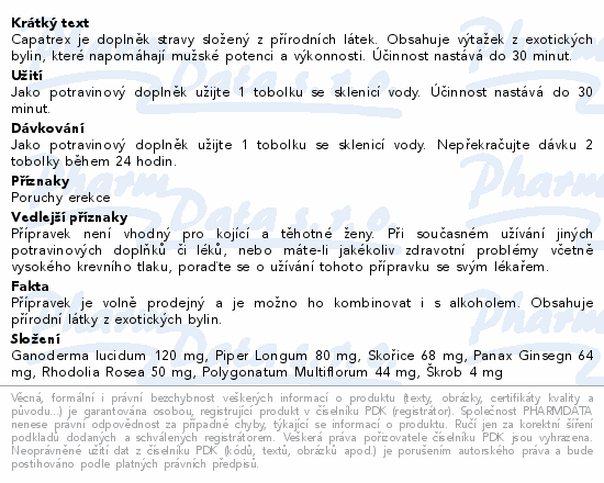 Capatrex je doplněk stravy složený z přírodních látek. Obsahuje výtažek z exotických bylin, které napomáhají mužské potenci a výkonnosti. Účinnost nastává do 30 minut.