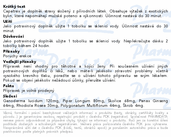 Capatrex je doplněk stravy složený z přírodních látek. Obsahuje výtažek z exotických bylin, které napomáhají mužské potenci a výkonnosti. Účinnost nastává do 30 minut.