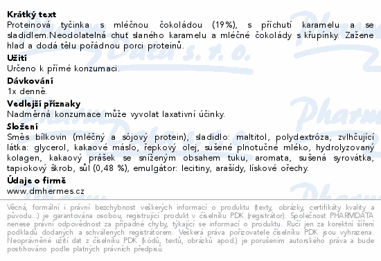 Proteinová tyčinka s mléčnou čokoládou (19%), s příchutí karamelu a se sladidlem.Neodolatelná chuť slaného karamelu a mléčné čokolády s křupínky. Zažene hlad a dodá tělu pořádnou porci proteinů.