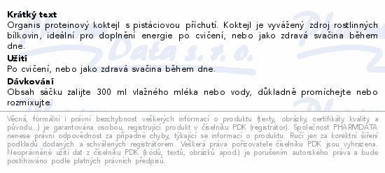 Organis proteinový koktejl s pistáciovou příchutí. Koktejl je vyvážený zdroj rostlinných bílkovin, ideální pro doplnění energie po cvičení, nebo jako zdravá svačina během dne.