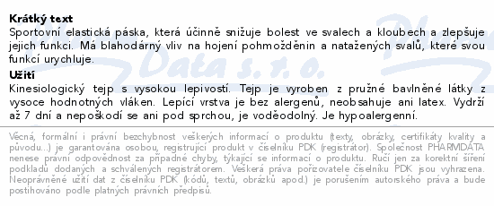 Sportovní elastická páska, která účinně snižuje bolest ve svalech a kloubech a zlepšuje jejich funkci. Má blahodárný vliv na hojení pohmožděnin a natažených svalů, které svou funkcí urychluje.