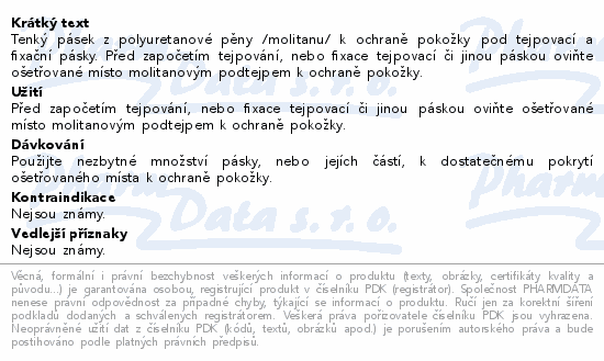 Tenký pásek z polyuretanové pěny /molitanu/ k ochraně pokožky pod tejpovací a fixační pásky. Před započetím tejpování, nebo fixace tejpovací či jinou páskou oviňte ošetřované místo molitanovým podtejpem k ochraně pokožky.