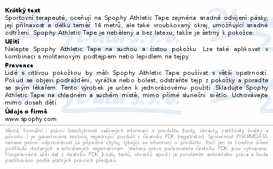 Sportovní terapeuté, oceňují na Spophy Athletic Tape zejména snadné odvíjení pásky, její přilnavost a délku téměř 14 metrů, ale také vroubkovaný okraj, umožňující snadné odtržení. Spophy Athletic Tape je nebělený a bez latexu, takže je šetrný k pokožce.