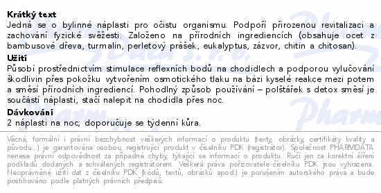 Jedná se o bylinné náplasti pro očistu organismu. Podpoří přirozenou revitalizaci a zachování fyzické svěžesti. Založeno na přírodních ingrediencích (obsahuje ocet z bambusové dřeva, turmalin, perleťový prášek, eukalyptus, zázvor, chitin a chitosan).
