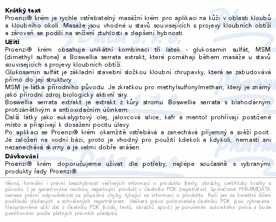 Proenzi® krém je rychle vstřebatelný masážní krém pro aplikaci na kůži v oblasti kloubů a kloubního okolí. Masáže jsou vhodné u stavů souvisejících s projevy kloubních obtíží a zároveň se podílí na snížení ztuhlosti a zlepšení hybnosti.