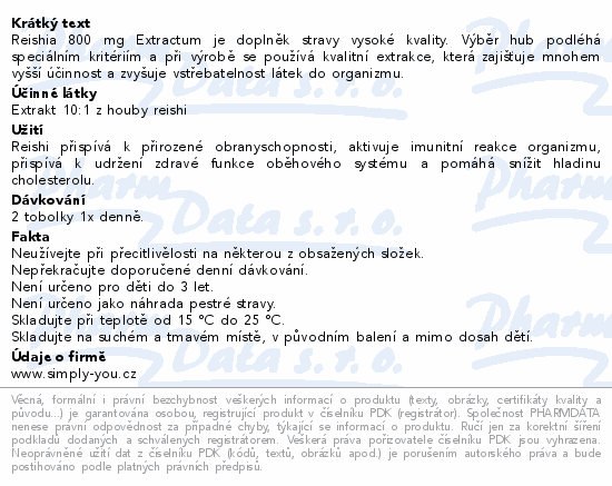 Reishia 800 mg Extractum je doplněk stravy vysoké kvality. Výběr hub podléhá speciálním kritériím a při výrobě se používá kvalitní extrakce, která zajišťuje mnohem vyšší účinnost a zvyšuje vstřebatelnost látek do organizmu.
