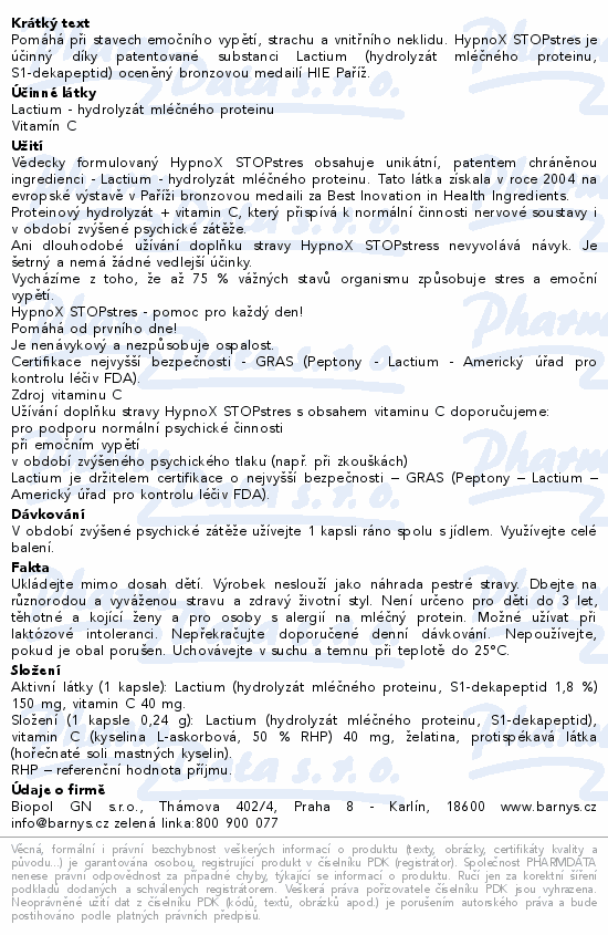 Pomáhá při stavech emočního vypětí, strachu a vnitřního neklidu. HypnoX STOPstres je účinný díky patentované substanci Lactium (hydrolyzát mléčného proteinu, S1-dekapeptid) oceněný bronzovou medailí HIE Paříž.