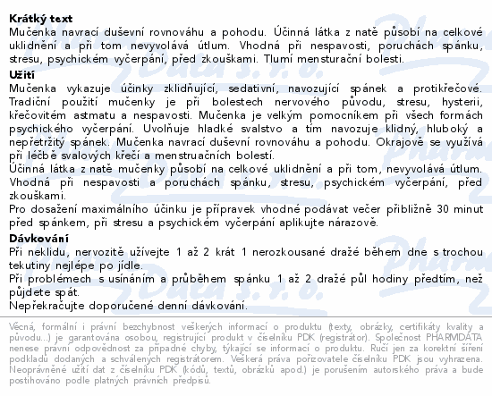 Mučenka navrací duševní rovnováhu a pohodu. Účinná látka z natě působí na celkové uklidnění a při tom nevyvolává útlum. Vhodná při nespavosti, poruchách spánku, stresu, psychickém vyčerpání, před zkouškami. Tlumí mensturační bolesti.