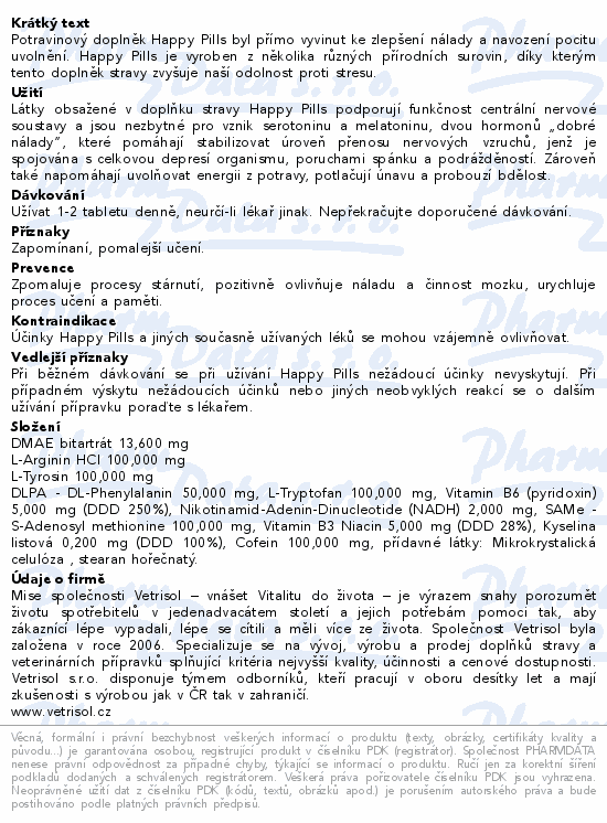 Potravinový doplněk Happy Pills byl přímo vyvinut ke zlepšení nálady a navození pocitu uvolnění. Happy Pills je vyroben z několika různých přírodních surovin, díky kterým tento doplněk stravy zvyšuje naší odolnost proti stresu.