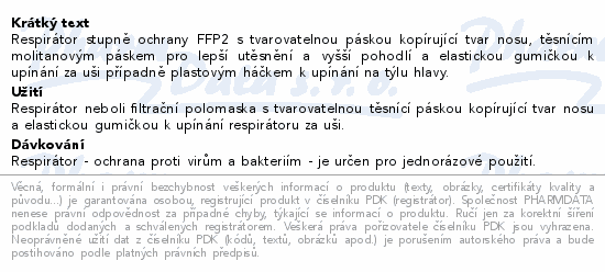 Respirátor stupně ochrany FFP2 s tvarovatelnou páskou kopírující tvar nosu, těsnícím molitanovým páskem pro lepší utěsnění a vyšší pohodlí a elastickou gumičkou k upínání za uši případně plastovým háčkem k upínání na týlu hlavy.