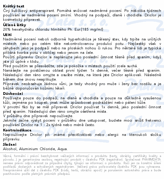 Čirý kuličkový antiperspirant. Pomáhá snižovat nadměrné pocení. Po několika týdnech používání se nadměrné pocení zmírní. Vhodný na podpaží, dlaně i chodidla. Driclor je kosmetický přípravek.