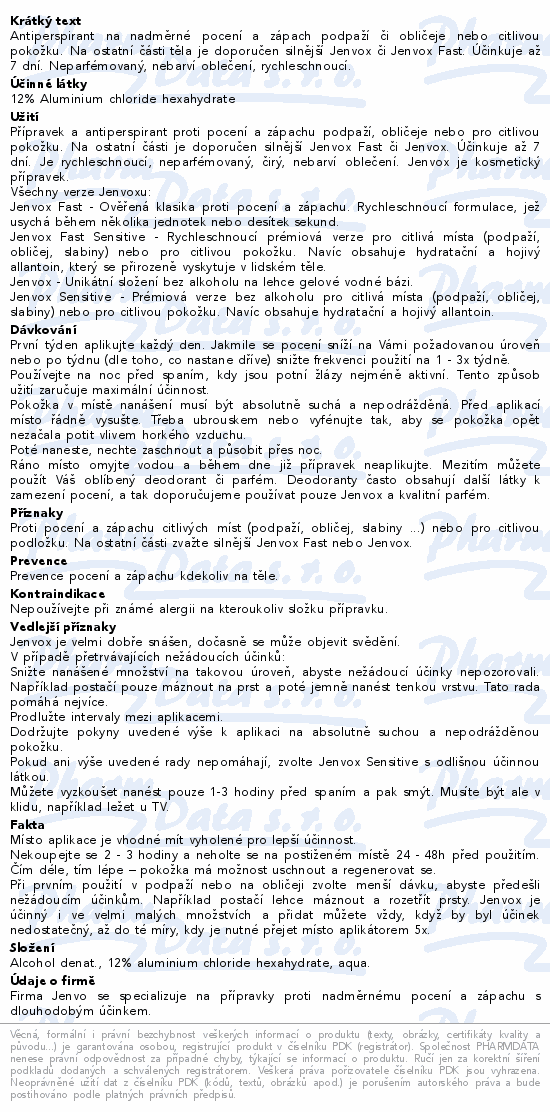 Antiperspirant na nadměrné pocení a zápach podpaží či obličeje nebo citlivou pokožku. Na ostatní části těla je doporučen silnější Jenvox či Jenvox Fast. Účinkuje až 7 dní. Neparfémovaný, nebarví oblečení, rychleschnoucí.