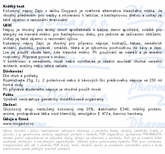 Kokosový nápoj Zajíc v sáčku Doypack je rostlinná alternativa klasického mléka. Je vhodný především pro osoby s intolerancí k laktóze, s bezlepkovou dietou a uvítají jej také zájemci o racionální stravování.