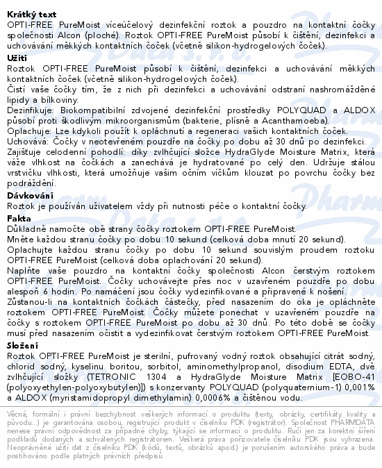OPTI-FREE® PureMoist® je víceúčelový dezinfekční roztok obsahující HydraGlyde® zvhlčující základ, který má patentované složení pro 16 hodinové zvlhčení, odstraňování lipidů a bílkovin pro jasné vidění a jemné složení, které zabíjí mikroorganismy.