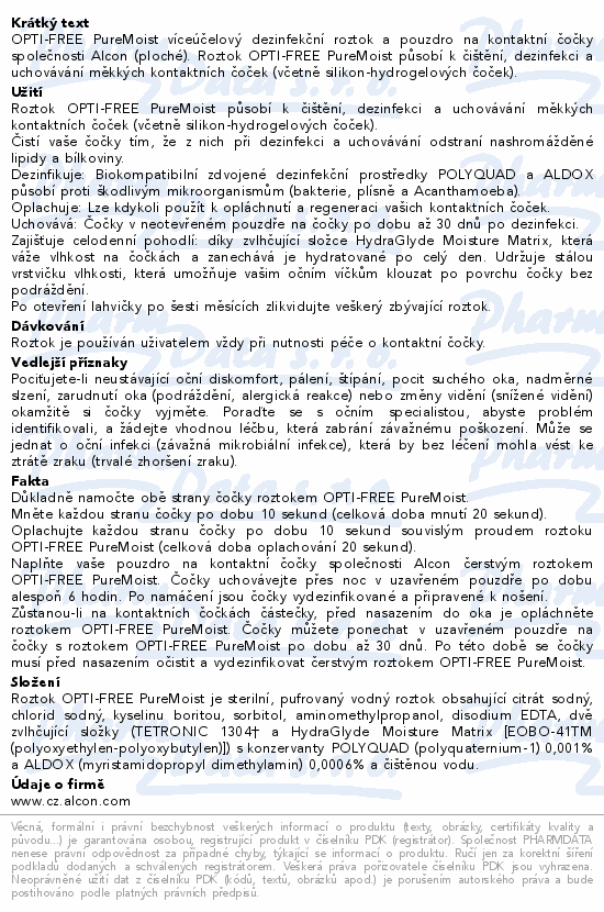 OPTI-FREE® PureMoist® je víceúčelový dezinfekční roztok obsahující HydraGlyde® zvhlčující základ, který má patentované složení pro 16 hodinové zvlhčení, odstraňování lipidů a bílkovin pro jasné vidění a jemné složení, které zabíjí mikroorganismy.