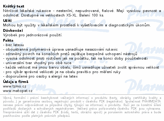 Nitrilové lékařské rukavice - nesterilní, nepudrované, fialové. Mají vysokou pevnost a odolnost. Dostupné ve velikostech XS-XL. Balení 100 ks.
