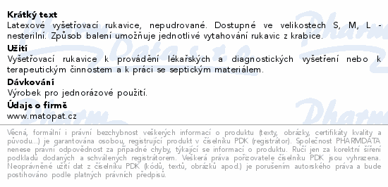 Latexové vyšetřovací rukavice, nepudrované. Dostupné ve velikostech S, M, L - nesterilní. Způsob balení umožňuje jednotlivé vytahování rukavic z krabice.