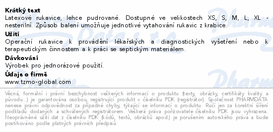 Latexové rukavice, lehce pudrované. Dostupné ve velikostech XS, S, M, L, XL - nesterilní. Způsob balení umožňuje jednotlivé vytahování rukavic z krabice.