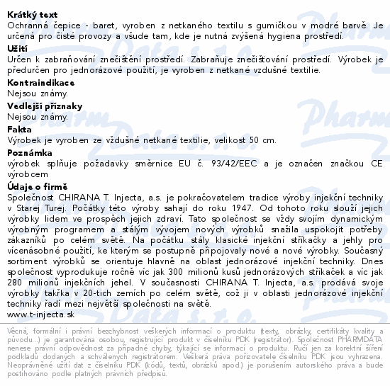 Ochranná čepice - baret, vyroben z netkaného textilu s gumičkou v modré barvě. Je určená pro čisté provozy a všude tam, kde je nutná zvýšená hygiena prostředí.