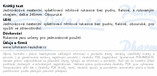 Jednorázové nesterilní vyšetřovací nitrilové rukavice bez pudru, fialové, s rolovaným okrajem, délka 240mm. Obouruké.
