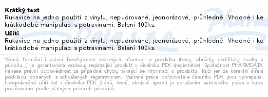 Rukavice na jedno použití z vinylu, nepudrované, jednorázové, průhledné. Vhodné i ke krátkodobé manipulaci s potravinami. Balení 100ks.