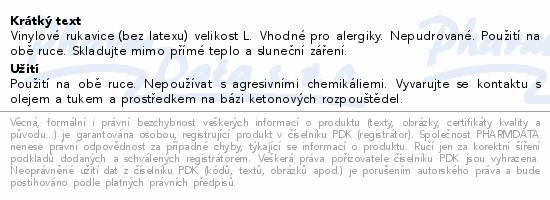 Vinylové rukavice (bez latexu) velikost L. Vhodné pro alergiky. Nepudrované. Použití na obě ruce. Skladujte mimo přímé teplo a sluneční záření.