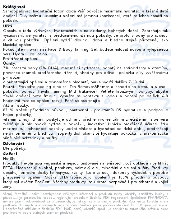 Samoopalovací hydratační lotion dodá Vaší pokožce maximální hydrataci a krásné zlaté opálení. Díky svému luxusnímu složení má jemnou konzistenci, která se lehce nanáší na pokožku.
