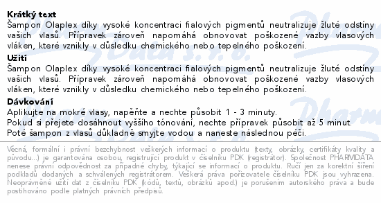 Šampon Olaplex díky vysoké koncentraci fialových pigmentů neutralizuje žluté odstíny vašich vlasů. Přípravek zároveň napomáhá obnovovat poškozené vazby vlasových vláken, které vznikly v důsledku chemického nebo tepelného poškození.