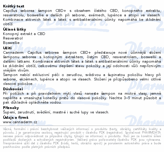 Capillus seborea šampon CBD+ s obsahem čístého CBD, konopného extraktu, resveratrolu, boswellie a dalších při seborei, exémech, lupénce a atopii ve vlasech. Kombinace aktivních látek a látek s antibakteriálními účinky napomáhá ke zklidnění obtíží.