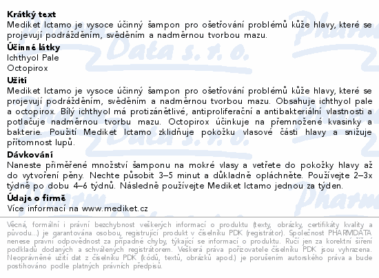 Mediket Ictamo je vysoce účinný šampon pro ošetřování problémů kůže hlavy, které se projevují podrážděním, svěděním a nadměrnou tvorbou mazu.