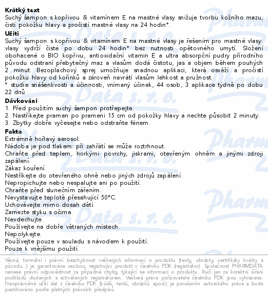 Suchý šampon s kopřivou & vitamínem E na mastné vlasy snižuje tvorbu kožního mazu, čistí pokožku hlavy a pročistí mastné vlasy na 24 hodin*.