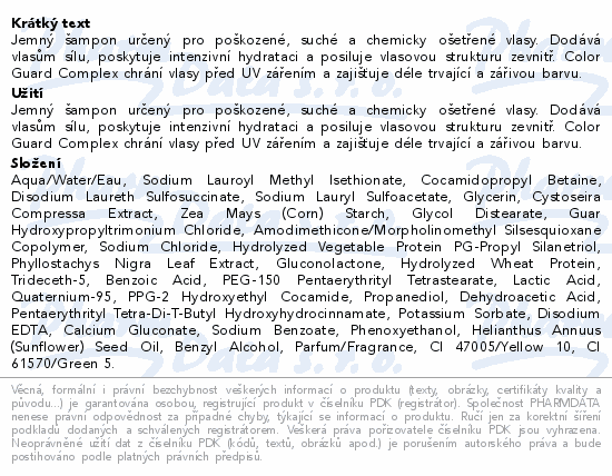 Jemný šampon určený pro poškozené, suché a chemicky ošetřené vlasy. Dodává vlasům sílu, poskytuje intenzivní hydrataci a posiluje vlasovou strukturu zevnitř. Color Guard Complex chrání vlasy před UV zářením a zajišťuje déle trvající a zářivou barvu.