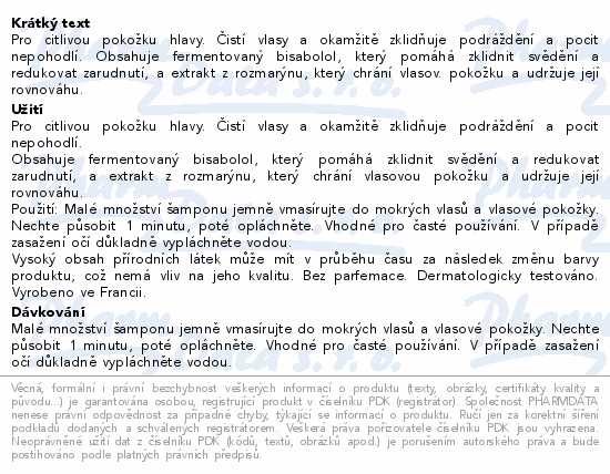 Pro citlivou pokožku hlavy. Čistí vlasy a okamžitě zklidňuje podráždění a pocit nepohodlí. Obsahuje fermentovaný bisabolol, který pomáhá zklidnit svědění a redukovat zarudnutí, a extrakt z rozmarýnu, který chrání vlasov. pokožku a udržuje její rovnováhu.