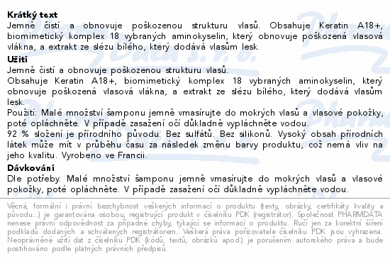 Jemně čistí a obnovuje poškozenou strukturu vlasů. Obsahuje Keratin A18+, biomimetický komplex 18 vybraných aminokyselin, který obnovuje poškozená vlasová vlákna, a extrakt ze slézu bílého, který dodává vlasům lesk.
