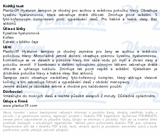 Plantur39 Hyaluron šampon je vhodný pro suchou a svědivou pokožku hlavy. Obsahuje kyselinu hyaluronovou, která zabraňuje ztrátě vlhkosti. Zmírňuje pocit svědění. S fyto-kofeinovým komplexem proti vypadávání vlasů. Pro hebké a lesklé vlasy. Bez silikonů.