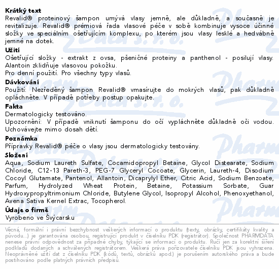 Revalid® proteinový šampon umývá vlasy jemně, ale důkladně, a současně je revitalizuje. Revalid® prémiová řada vlasové péče v sobě kombinuje vysoce účinné složky ve speciálním ošetřujícím komplexu, po kterém jsou vlasy lesklé a hedvábně jemné na dotek.