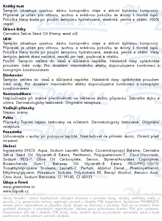 Šampón obsahuje vysokou dávku konopného oleje a aktivní bylinnou kompozici. Přípravek je určen pro citlivou, suchou a svědivou pokožku se sklony k tvorbě lupů. Pokožka hlavy bude po použití šampónu hydratovaná, elastická, jemná a vitální. 100% vegan